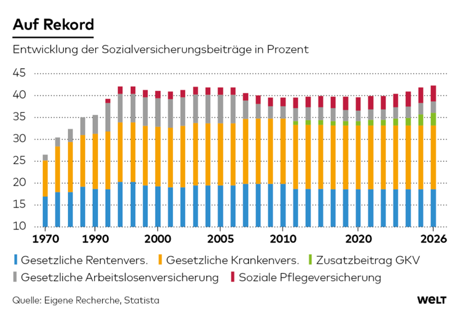Německo překročilo historický rekord: celková zátěž sociálních odvodů stoupne na 42,3 % hrubé mzdy. To není vedlejší mzdová položka, jak slovo Lohnnebenkosten naznačuje. To je skutečné druhé povinné zaměstnání – jen bez výplaty. A dopady?