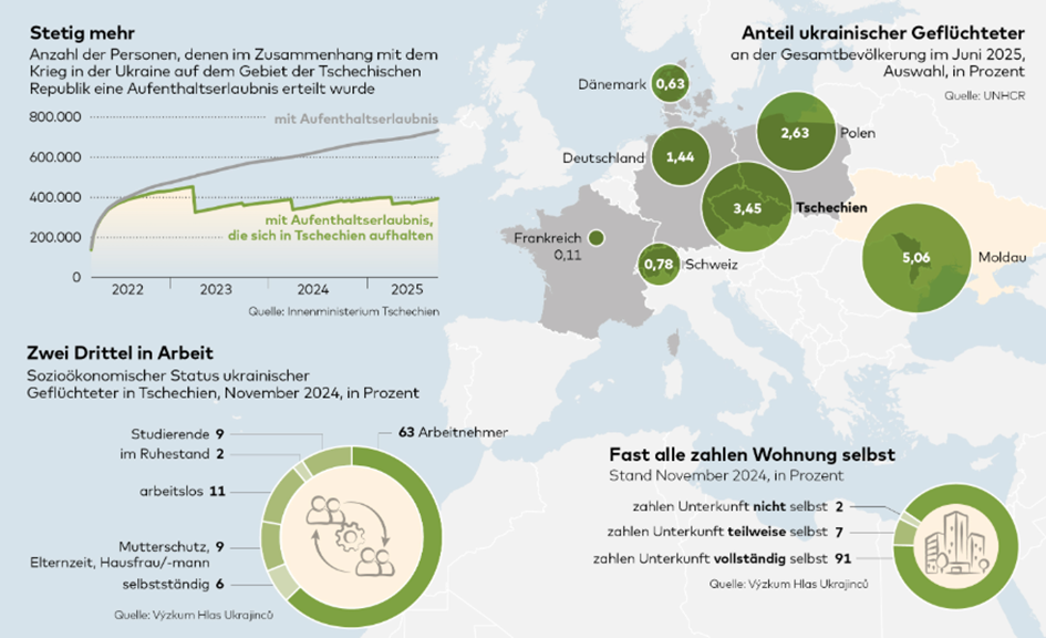 Podle průzkumu agentury CVVM má 70 % ukrajinských uprchlíků v Česku zaměstnání, a to většinou na plný úvazek. Pouze 11 % je registrováno jako nezaměstnaní.
