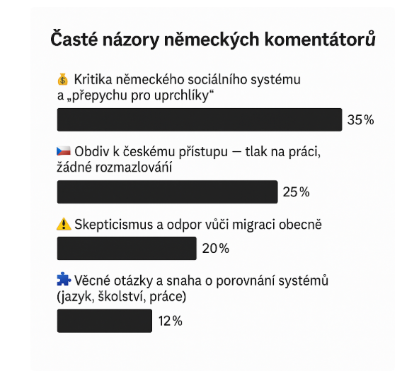 Zatímco samotný článek Die Welt chválí Česko za pragmatický přístup („Tschechien meistert die Integration mit Bravour“), čtenáři v komentářích obracejí pozornost k sobě – k problémům německého sociálního systému, migrační politiky a byrokracie.