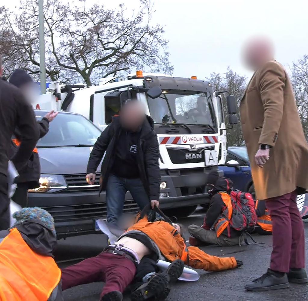 Jen chvíli poté, co levicoví extremisté usedají, vyskakují z aut první motoristé. Okamžitě situaci pochopí. Několik mužů popadne aktivisty za paže a pokusí se je stáhnout ze silnice. Přesně na takové situace je připravena „Vzpoura poslední generace“. Skupina pořádá „akční školení“. Zvláště účinná blokáda je věcí cviku. „Zůstáváte přísně nenásilní, jen necháte své tělo uvolněné,“ vysvětluje Hinrichs. Jakmile je aktivista odvlečen ze silnice, doplazí se na ni zpět.
