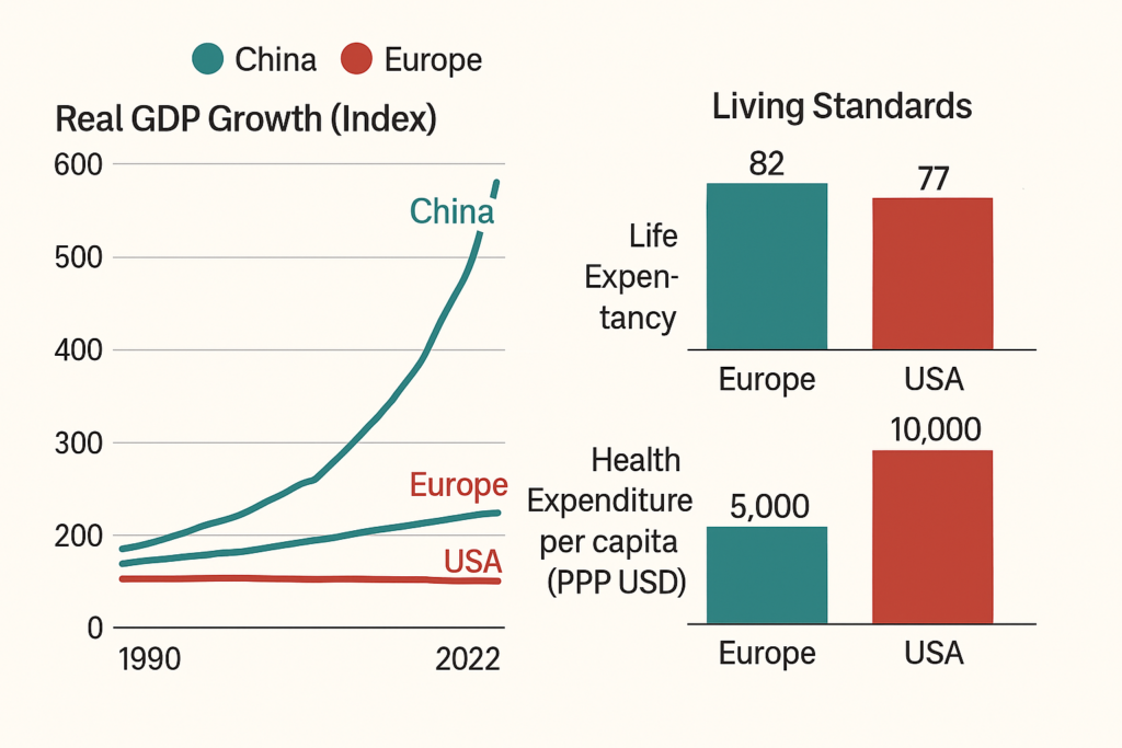 Častý slepý úhel amerických kritiků: evropský model vytváří širší blahobyt. Data ukazují delší život v EU než v USA, nižší mateřskou úmrtnost a lepší přístup ke zdravotní péči pro běžnou populaci. USA utrácejí za zdravotnictví více na hlavu, ale systém má nízkou efektivitu. Evropský „díl koláče“ jde částečně do volného času: průměrný Američan odpracuje kolem 1 789 hodin ročně, zatímco Evropan (např. Rakousko) výrazně méně — a přesto udržuje vysokou produktivitu.