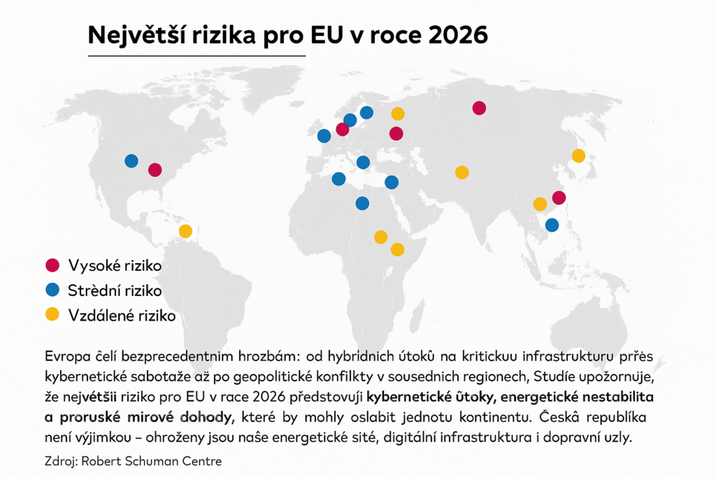 Podle analýzy European University Institute, kterou připravilo více než 500 odborníků na politiku a bezpečnost, je nejpravděpodobnějším rizikem pro Evropu v roce 2026 masivní kybernetický a fyzický útok na energetické, digitální a dopravní systémy. „Hybride Kriegsführung“ – hybridní válka – se stává hlavní zbraní Ruska, které už dnes testuje odolnost evropských států.