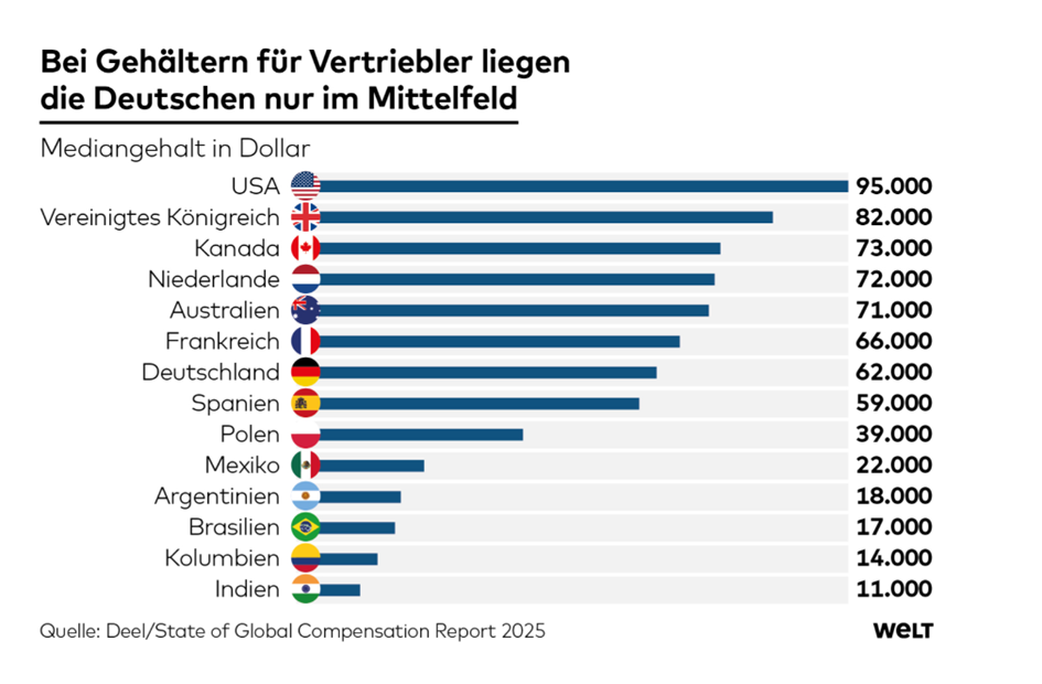 Zatímco v USA dosahuje medián v těchto profesích 95 000 USD, v Německu je to jen 62 000 USD – tedy o třetinu méně.