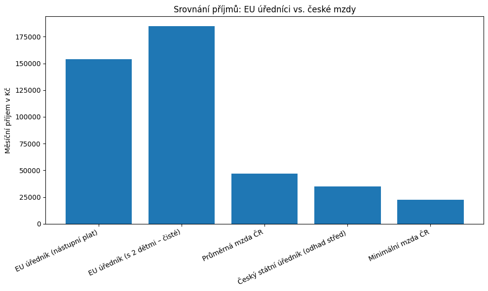 Z českého pohledu je tady nejsilnější právě srovnání s domácí veřejnou správou. V Česku se platy zaměstnanců ve státní a veřejné správě odvozují z tarifních tabulek podle platové třídy a započitatelné praxe. Oficiální tarifní tabulka MPSV ukazuje, že například v 9. platové třídě činí měsíční tarif 23 110 až 33 220 Kč, zatímco ve 12. platové třídě je to 28 650 až 41 520 Kč. I vyšší kvalifikovaná úřednická místa se tedy v základním tarifu pohybují hluboko pod bruselským nástupem, a to ještě bez ohledu na daňové a rodinné výhody, které WELT v případě EU aparátu kritizuje. Úřad vlády navíc připomíná, že základní složkou platu je u těchto pozic právě platový tarif podle třídy a praxe, nikoli „volný trh“. (Příručka pro personální agendu)