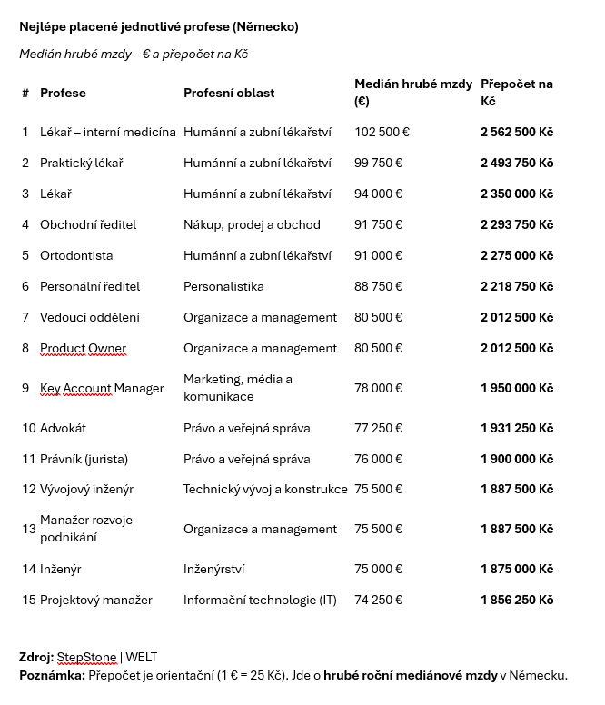 Kdo chce v Německu v roce 2026 patřit mezi nejlépe placené zaměstnance, musí především zvolit správnou profesi. Vyplývá to z nového mzdového reportu platformy StepStone, která analyzovala více než 1,3 milionu anonymizovaných mzdových dat zaměstnanců v Německu. Výsledky, které měly k dispozici redakce WELT a Business Insider, ukazují obrovské rozdíly mezi jednotlivými obory, profesemi i regiony – a zároveň odhalují, kde se práce finančně vyplácí a kde naopak zůstává dlouhodobě podhodnocená.