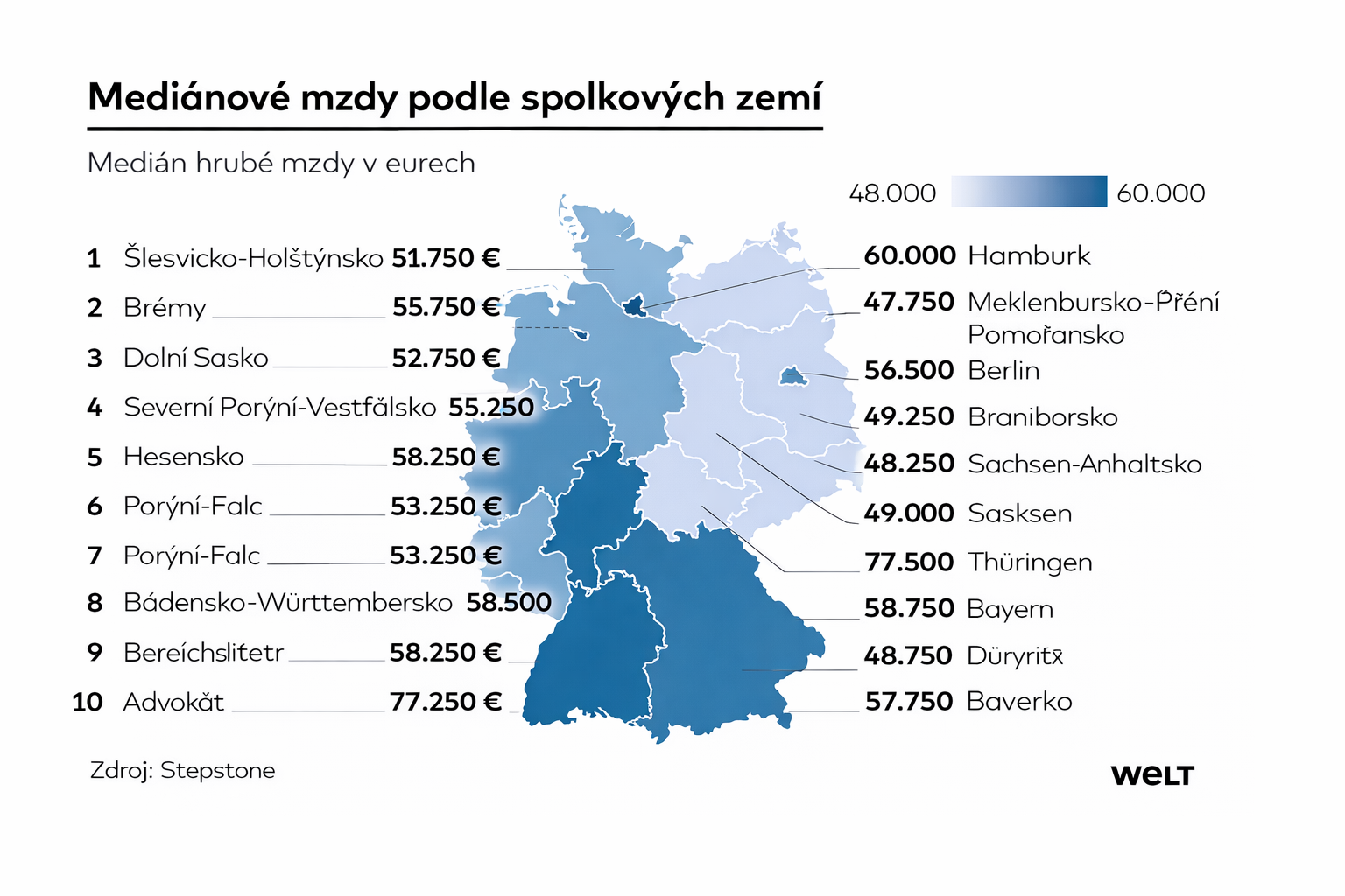 Poznámka: Přepočet je orientační (1 € = 25 Kč). Jde o hrubé roční mediánové mzdy v Německu.