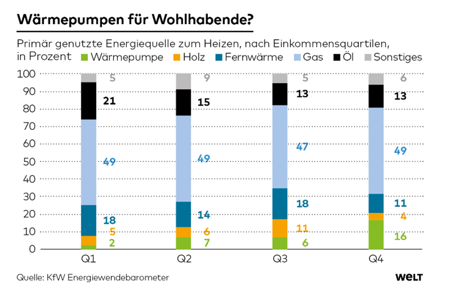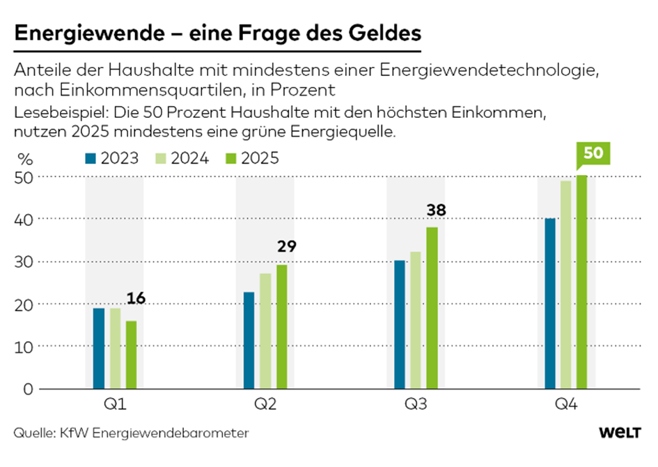„Mnoho nízkopříjmových domácností je pod vysokým finančním tlakem a nemá prostředky na investice do zelených technologií,“ uvedl hlavní ekonom KfW Dirk Schumacher. Podle něj je nutné, aby stát vytvořil cílené pobídky a technická řešení, která zapojí i chudší vrstvy a udrží širokou veřejnou podporu pro klimatickou politiku.