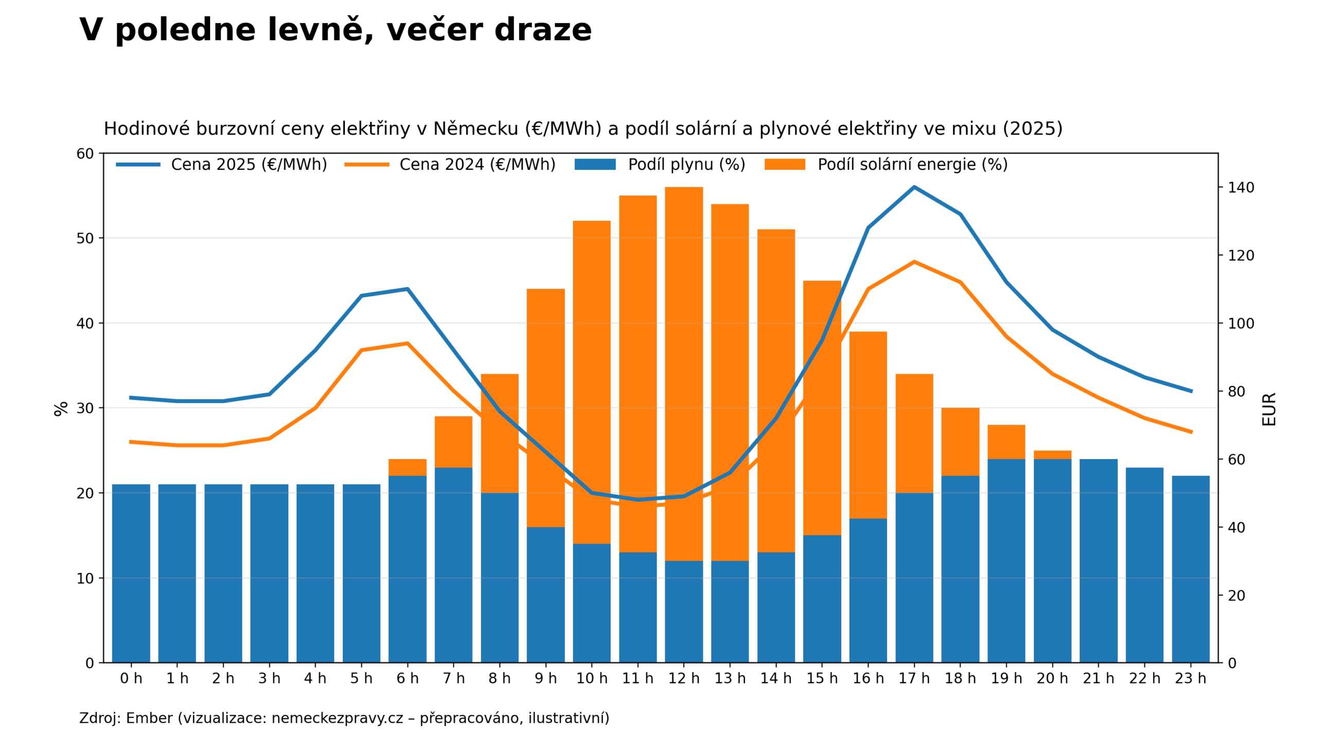 Zřetelně je to vidět v Německu a Španělsku. V obou zemích ceny elektřiny kolem poledne prudce klesají, protože trh zaplaví levná solární energie. V Německu klesly ceny v poledních hodinách meziročně jen o 8 %, zatímco večer vzrostly o 19 %. Ve Španělsku dosahuje solární energie v poledne více než 60 % výroby elektřiny, zatímco večer prakticky mizí.
