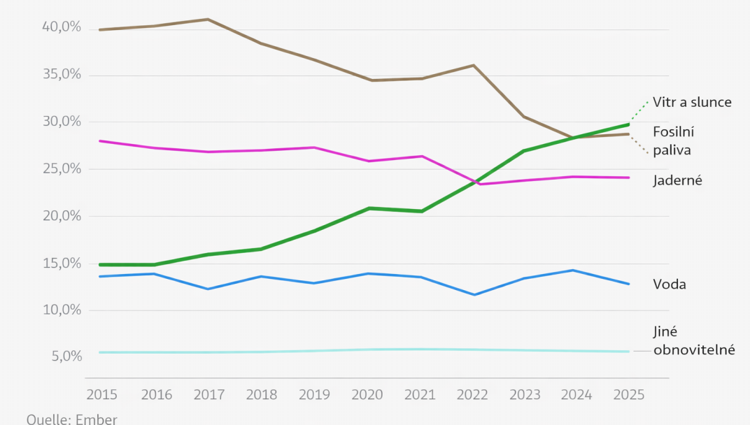 Vítr a slunce se v roce 2025 podílely na výrobě 30 % veškeré elektřiny v EU, zatímco uhlí, plyn a další fosilní paliva dohromady pouze 29 %. Ještě před pěti lety činil podíl větru a solární energie pouhých 20 %. Tempo změny je tedy mimořádně rychlé.