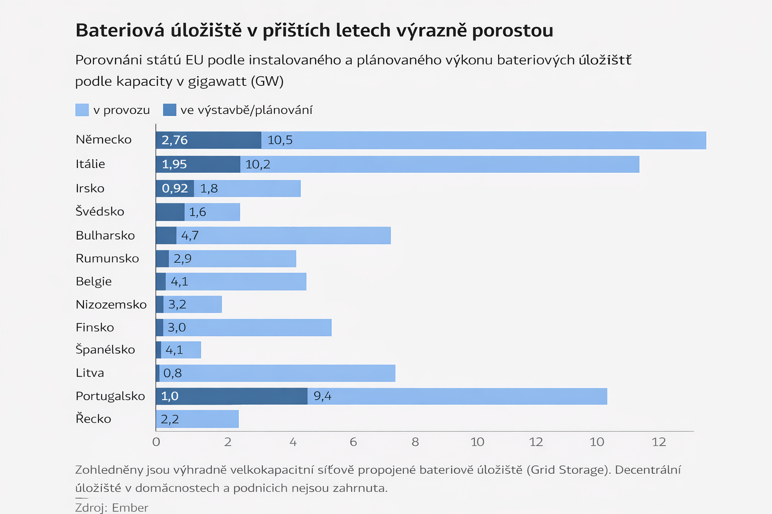 Nejrychlejší růst zaznamenaly Řecko, Španělsko a Polsko, kde dosud úložiště téměř neexistovala. Německo a Polsko dnes vedou v počtu plánovaných projektů, následované Itálií. Pokud se všechny projekty uskuteční, může výkon baterií vzrůst až na 40 gigawattů, tedy desetinásobek oproti roku 2023.