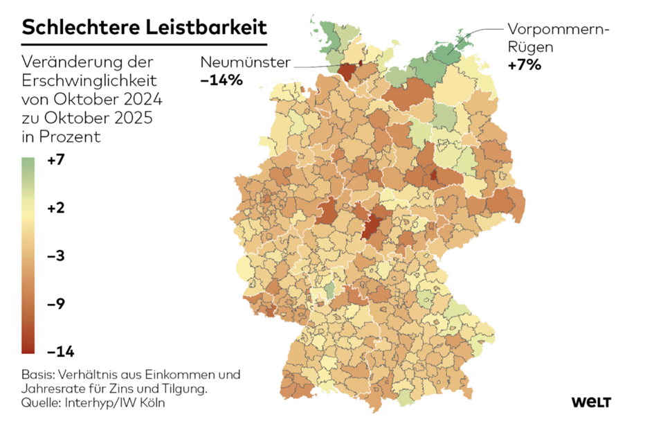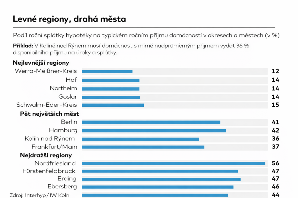 Německý trh s bydlením je extrémně regionálně rozdílný. Zatímco v některých venkovských okresech domácnosti vydávají na splátky hypotéky jen kolem 12–15 % příjmů, ve velkých městech a jejich okolí se podíl blíží nebo přesahuje hranici 40 %, která je dlouhodobě považována za rizikovou.