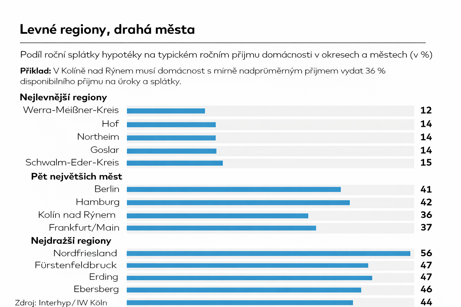 Německý trh s bydlením je extrémně regionálně rozdílný. Zatímco v některých venkovských okresech domácnosti vydávají na splátky hypotéky jen kolem 12–15 % příjmů, ve velkých městech a jejich okolí se podíl blíží nebo přesahuje hranici 40 %, která je dlouhodobě považována za rizikovou.