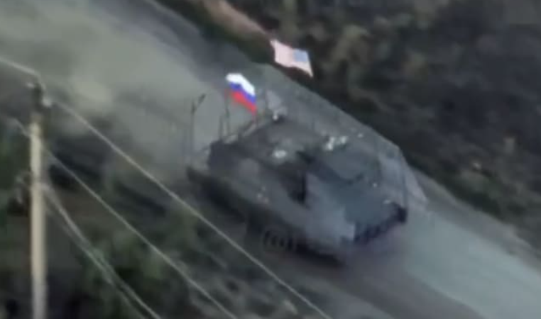 Vedoucí kanceláře ukrajinského prezidenta Andrij Jermak zveřejnil na Telegramu videozáznam, který měl odvysílat ruský státní kanál RT. Autenticitu záběrů zatím nelze nezávisle ověřit. Na videu má být zachycen obrněný transportér se dvěma vlajkami – ruskou a americkou.