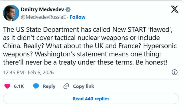 Podle Medveděva je americká argumentace selektivní a účelová. Pokud je problémem to, že New START nezahrnoval taktické jaderné zbraně nebo nové technologie, jako jsou hypersonické nosiče, pak by se podle něj mělo mluvit i o evropských jaderných arzenálech. Skutečný vzkaz Washingtonu je podle Medveděva zřejmý: Spojené státy v tuto chvíli o žádnou novou smlouvu nestojí.